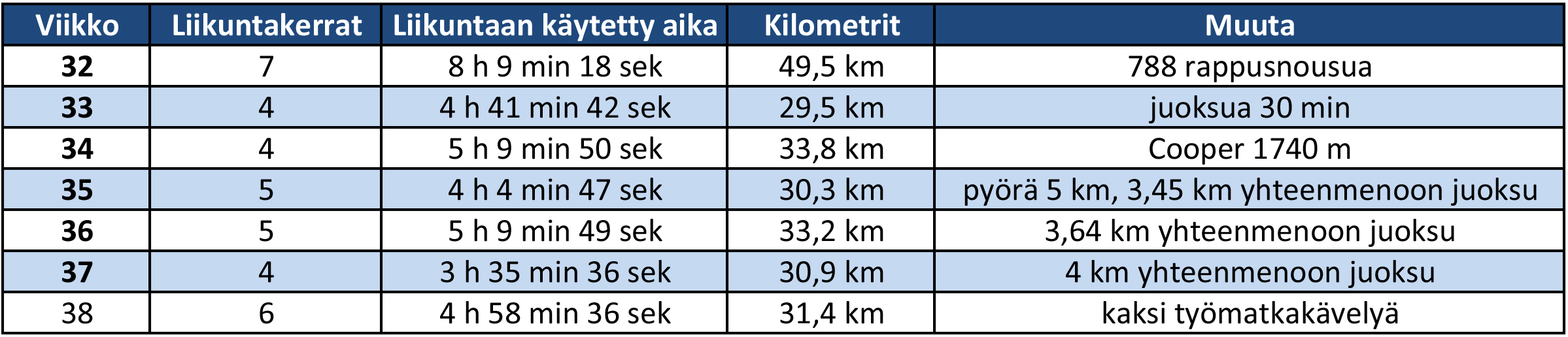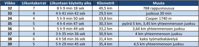 Viikon liikuntamäärä täydentyi sunnuntain iltalenkillä. Tänään kipittelin nykyelämäni pisimmän yhtäjaksoisen juoksun, 4,5 kilometriä. Paluumatka taittui kävellen. Tässä taulukoidut viikon 39 liikutukset.