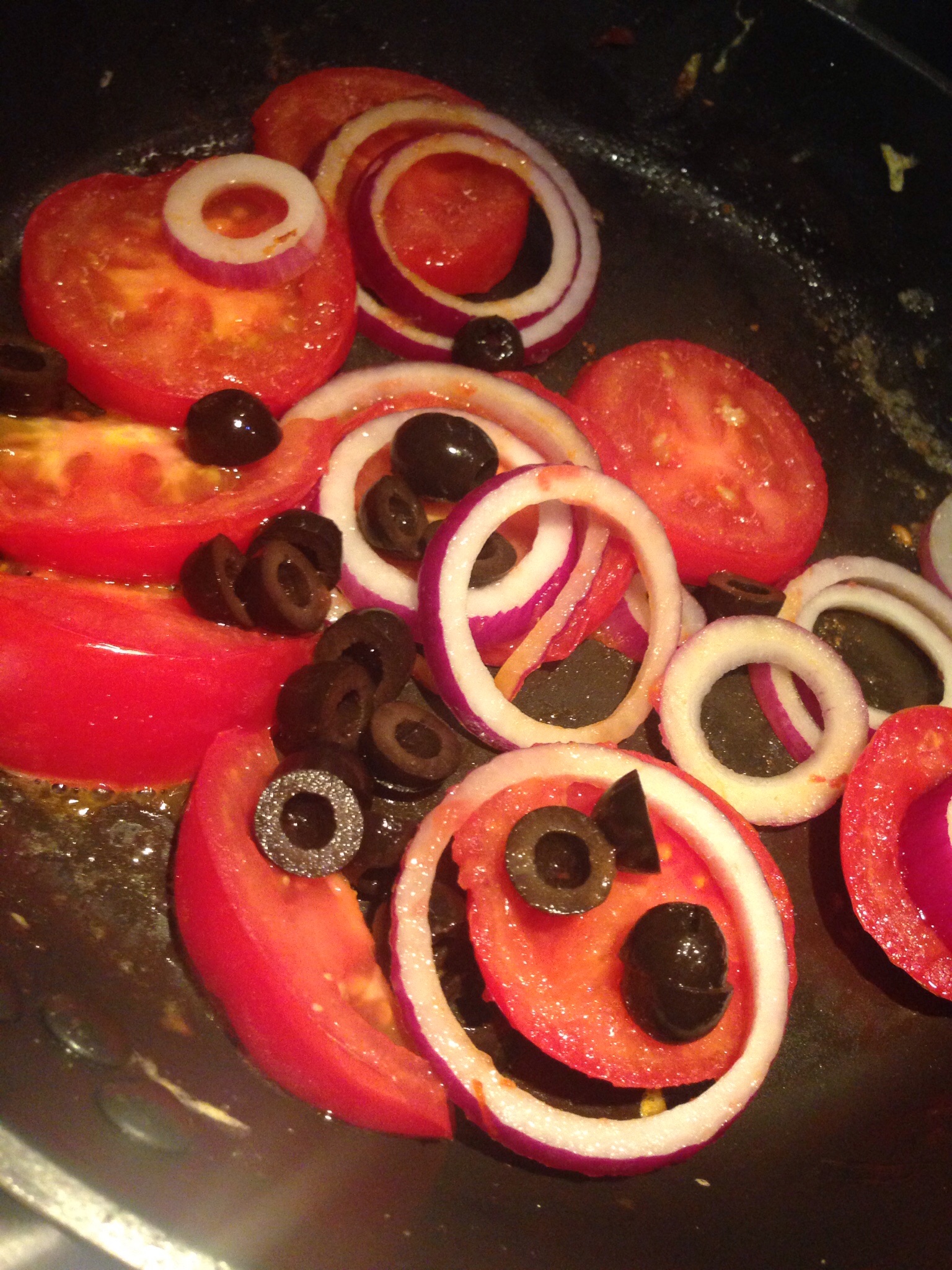 Luomumunista pyöräytetty auringonkeltainen munakas saa lisäväriä ja makua tomaatista, punasipulista ja oliiveista.