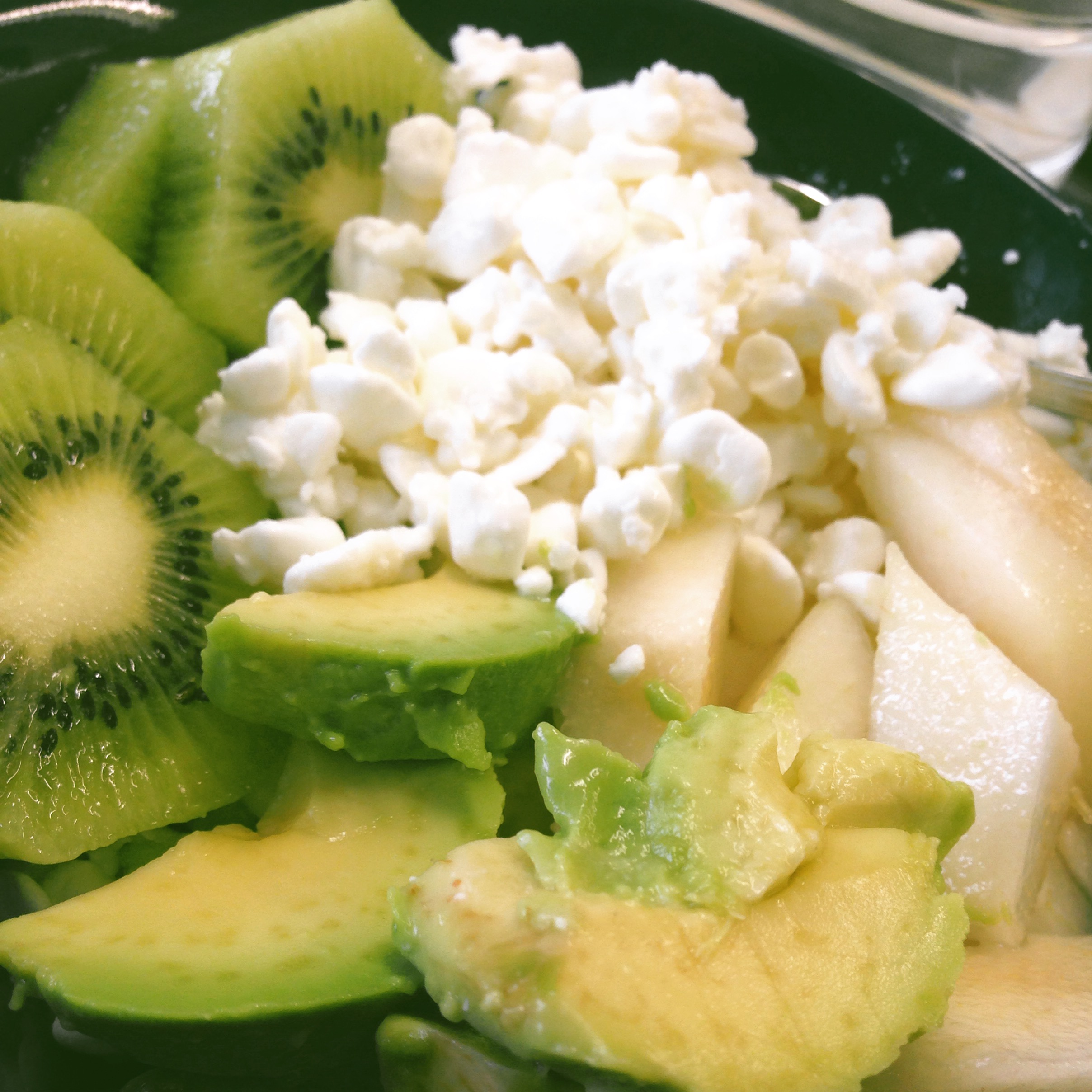 Työpäivän välipalalla vihersi: päärynää, kiiviä ja avokadoa raejuuston kaverina.